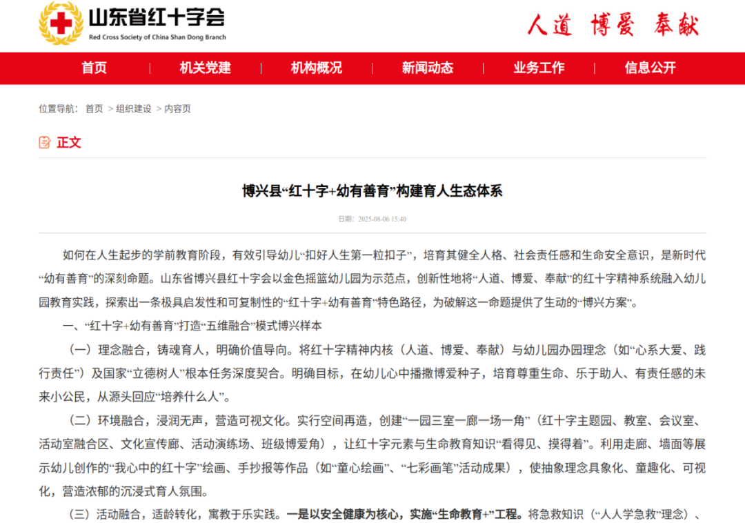 8月6日,山东省红十字会官方网站刊发博兴县红十字会《博兴县“红十字+幼有善育”构建育人生态体系》,对我县红十字青少年工作做法进行宣传报道。